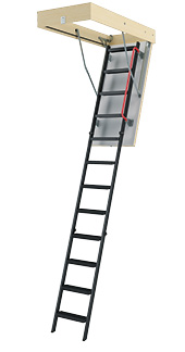 Чердачная лестница LML представляет собой складную конструкцию из металлического лестничного марша и термоизоляционной крышки люка белого цвета и боковым металлическим поручнем.