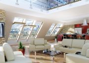 Конструкция окна подобна конструкции окон со среднеповоротным открыванием, исключение составляет ось поворота створки, расположенная выше центральной части оконного короба. Такое расположение петель позволяет изготавливать окна большой высоты (до 206 см), тем самым обеспечивая дополнительное освещение помещения и обзор. Технологии изготовления окон для крыши позволили создать окно высотой более 200 см, что исключает необходимость объединения нескольких окон в вертикальные группы. Створка фиксируется под углом 160° для удобного мытья. Окно с системой topSafe |