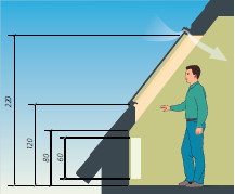 Очень важно выбрать правильную высоту монтажа окна в плоскости кровли. В помещениях, где уровень пола находится ниже 25 м над землей, расстояние от нижнего края окна до пола должна быть не менее 85 см. В помещения, где уровень пола находится выше 25 м над землей, расстояние от нижнего края окна до пола должна буть не менее 110 см. Чем выше от пола замонтировано окно, тем лучше будет освещение помещения. Согласно с нормой DIN 5034-1 пункт 4.2.2a „верхний край прозрачной поверхности окна (или окон) должен находится, не нижче 220 см над полом”.